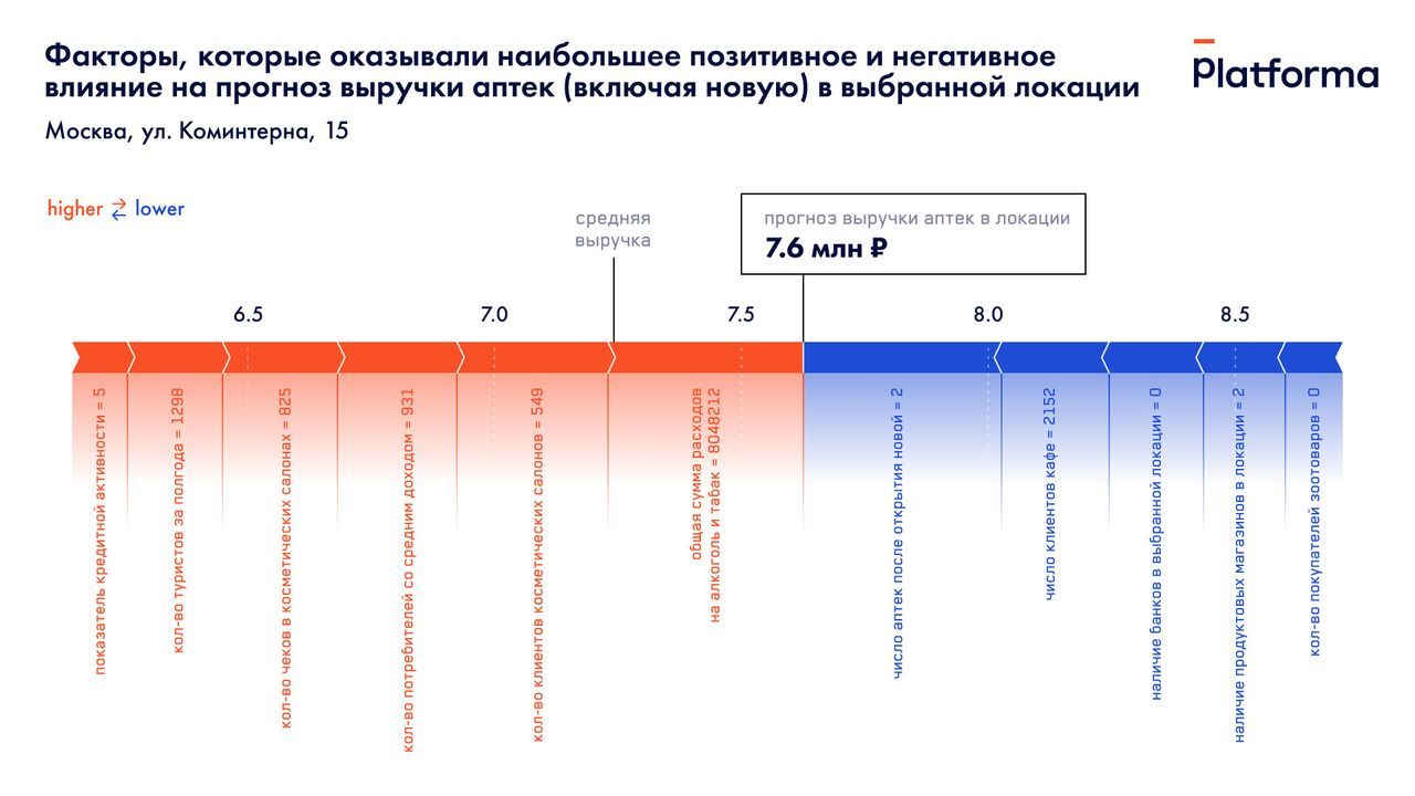 Математическая модель показывает, что в данной локации аптека будет успешнее, чем в среднем по городу с прогнозной выручкой 7,6 млн рублей против 7,25 млн. Из нескольких сотен проанализированных факторов наибольший положительный вклад в прогноз внесли общие расходы местных жителей на алкоголь и табак. Связь этого фактора с прогнозом не прямая и может быть обусловлена другими факторами, например, плотностью населения в данном районе. Второй по важности фактор — количество клиентов салонов красоты в выбранной локации. Также достаточно значимым критерием оказалось присутствие в данной локации потребителей со средним доходом.