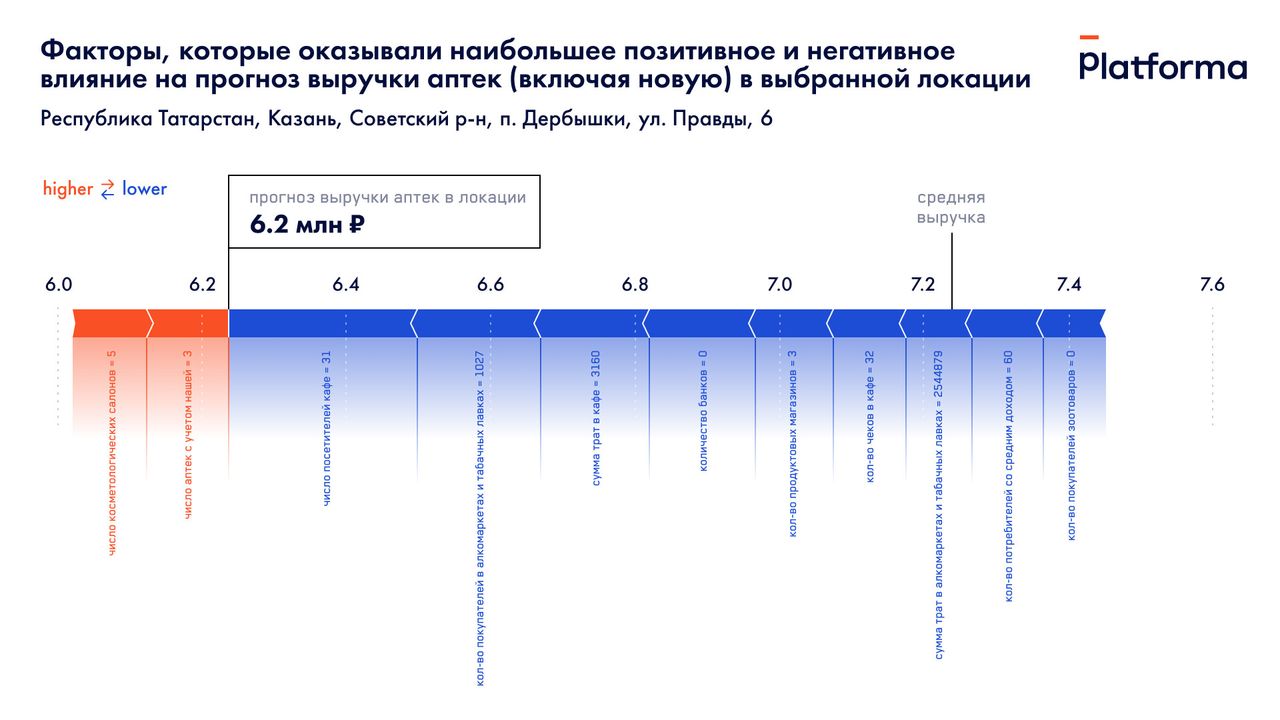 Как видно на графике, аптека в данной локации много выручки не принесет – ее прогнозный оборот, согласно данным нашей математической модели, около 6,2 млн рублей против почти 7,3 млн в среднем по городу. Наибольший отрицательный вклад в прогноз внесло небольшое число клиентов кафе и покупателей алкомаркетов. Также отрицательно на потенциальной выручке сказалось отсутствие банков в локации.