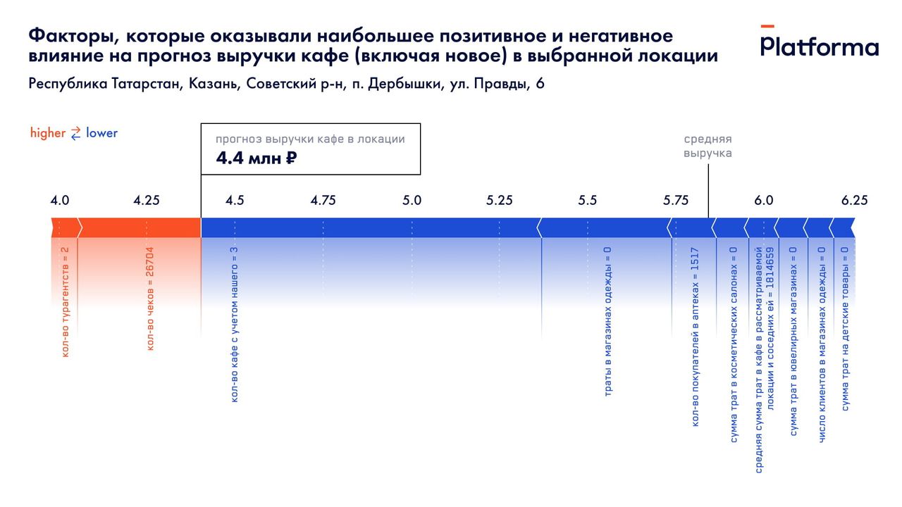 К сожалению, кафе в данной локации тоже не обещает быть достаточно успешным – его прогнозная выручка составляет 4,4 млн рублей против 5,8 млн в среднем по городу. Количество конкурентов в локации (3 с учетом нашей точки) сильнее всего отрицательно повлияло на прогноз. Отсутствие покупок одежды, детских товаров, трат в салонах красоты, а также зоомагазинах также негативно повлияли на вероятность эффективности бизнеса в данном районе.
