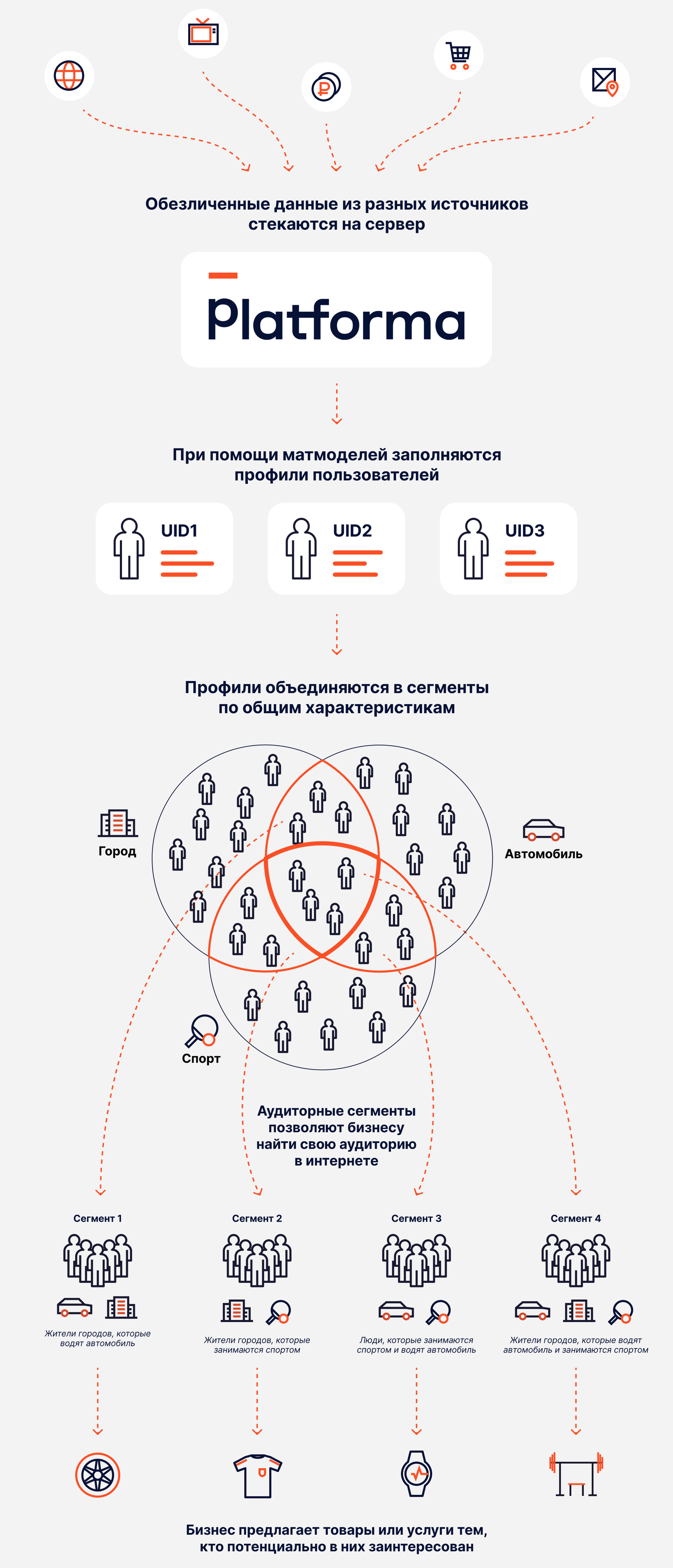 - На основе этой информации формируем профили пользователей и аудиторные сегменты — базовые или кастомизированные под конкретную задачу клиента.